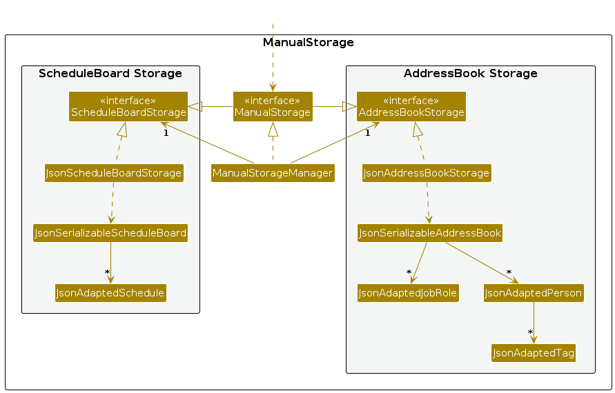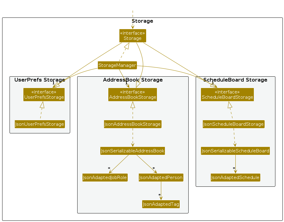 the data to this chosen location).UserPrefsStorage, and return dummy values like Optional#empty() for readUserPrefs() or an empty String for getUserPrefsFilePath()UserPrefsStorage.ManualStorage AddressBookStorage and ScheduleBoardStorage.ManualStorageManager, will implement ManualStorage and implement methods for reading and writing data pertaining to candidates and interview schedules.Storage and StorageManager, the benefit is that, to store data manually, classes and objects no longer have to worry about dealing with user preferences.